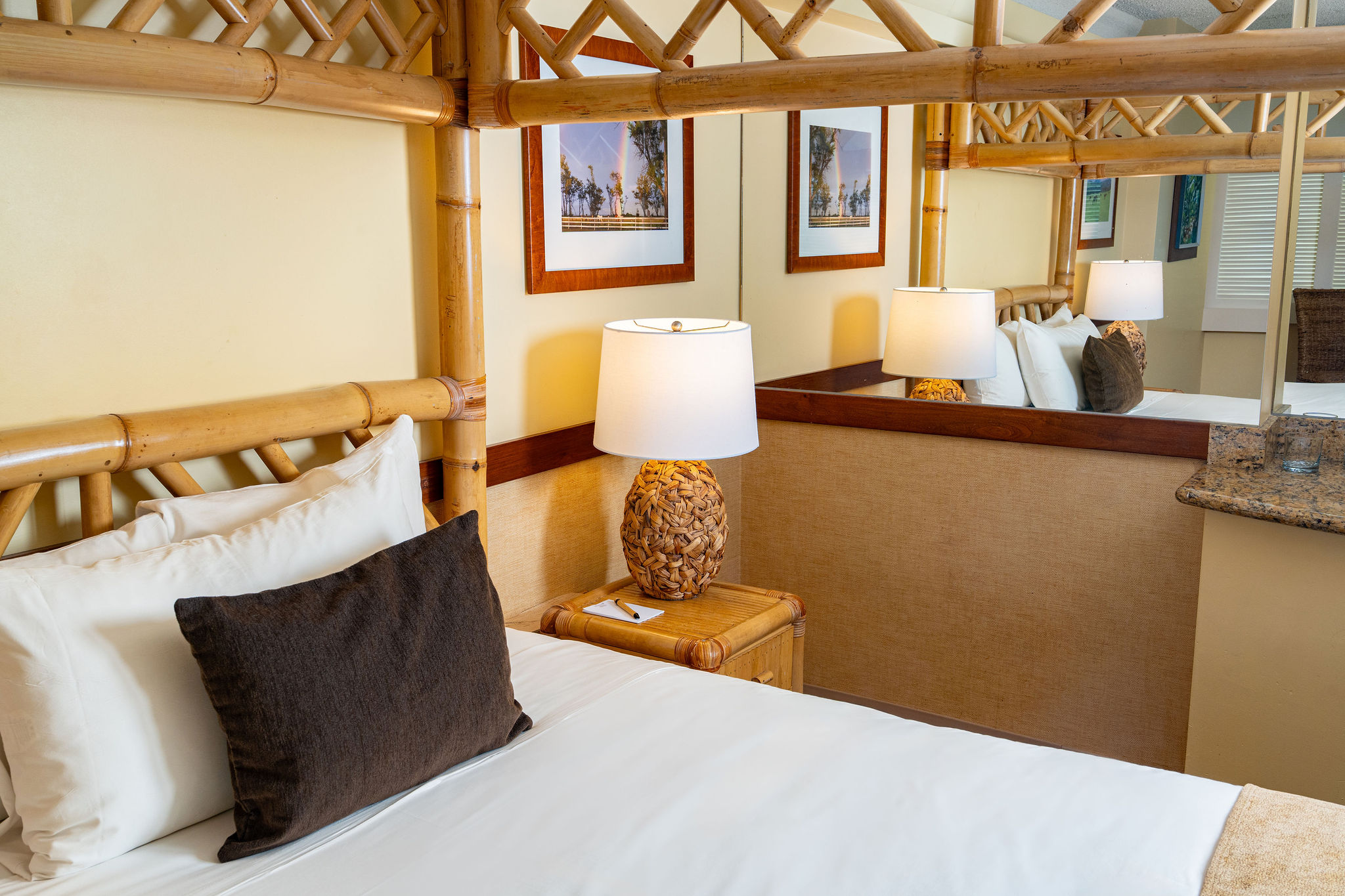 Relive old Hawaii in our Bamboo Queen room. Designed around an eye-catching canopy bed, this room is carefully composed of wooden bamboo furniture and tropical floral prints, all while having the modern conveniences you need.